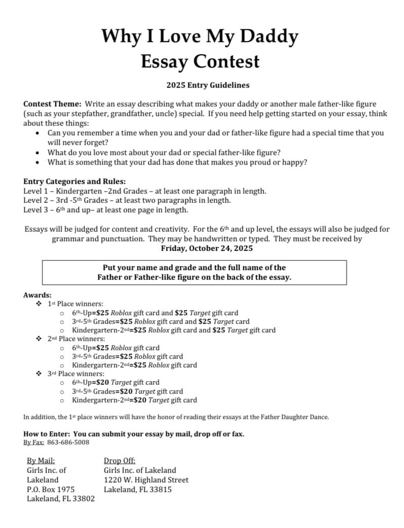 This event offers a chance for girls and young women to spend with their fathers or father figures a memorable evening that includes dinner, dancing and entertainment, photo booth fun, party favors and raffle prizes. The event is a way to honor the relationship and strengthen the bonds between daughters and their fathers or other positive male role models.